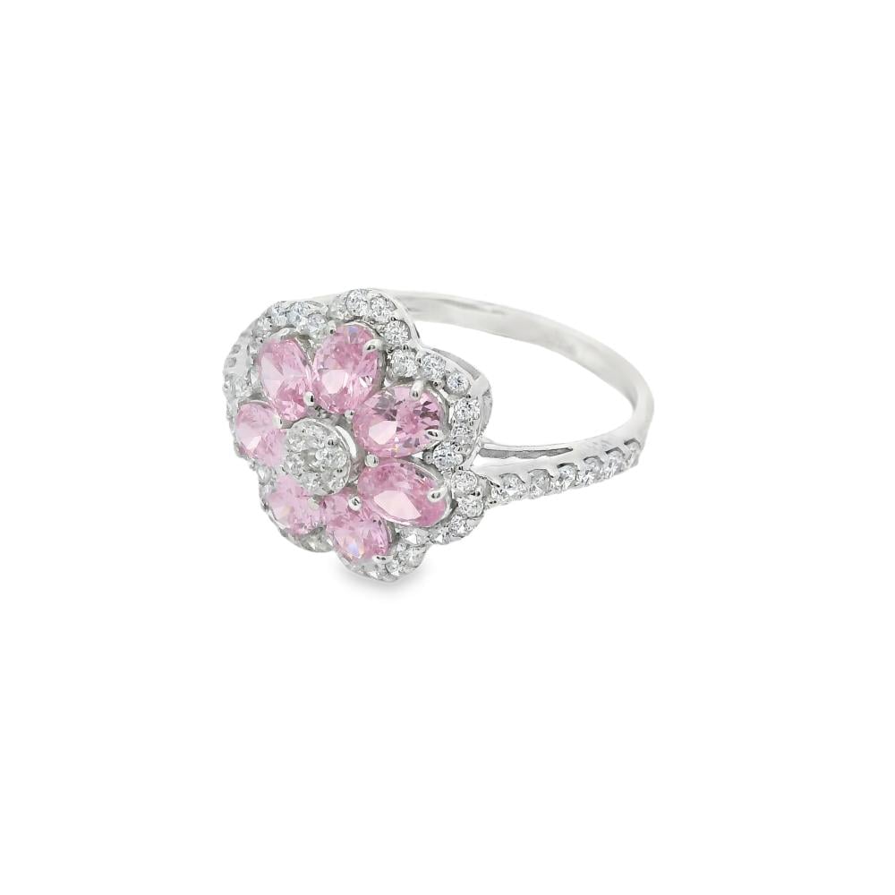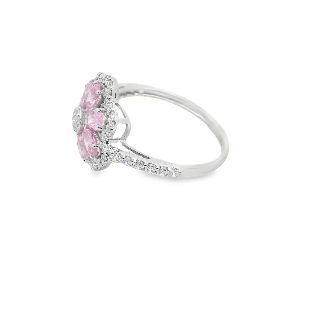 فصوص وردية متلألئة تتوسطها أحجار براقة على قاعدة من الذهب الأبيض، تمنحك بريقًا يلفت الأنظار دون مبالغة.